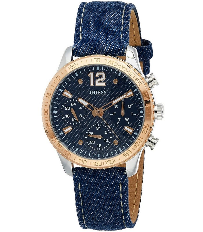 Montre pour Femme de la Marque : Guess – Référence : W1057L1 – Fonctionnalités : Chronographe – Mouvement : Quartz – Matière du boîtier : Acier inoxydable – Diamètre du boîtier : 38 mm – Matière du bracelet : Tissu – Largeur du bracelet : 18 mm – Type de verre : Minéral – Garantie : 2 ans Livré avec son coffret original, sac et certificat d’authenticité.